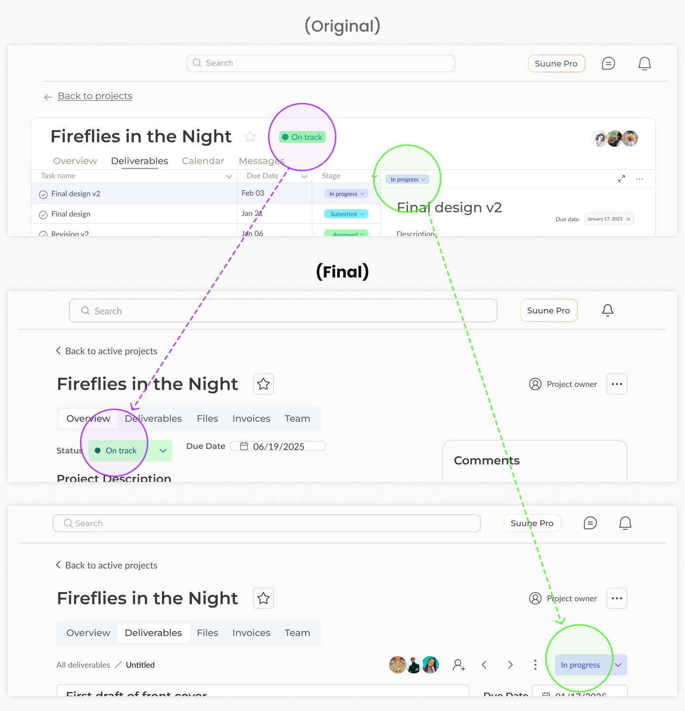 The project status is removed to be only shown in the “Overview” page, avoiding distraction and confusion with the deliverable stages in the detail page.